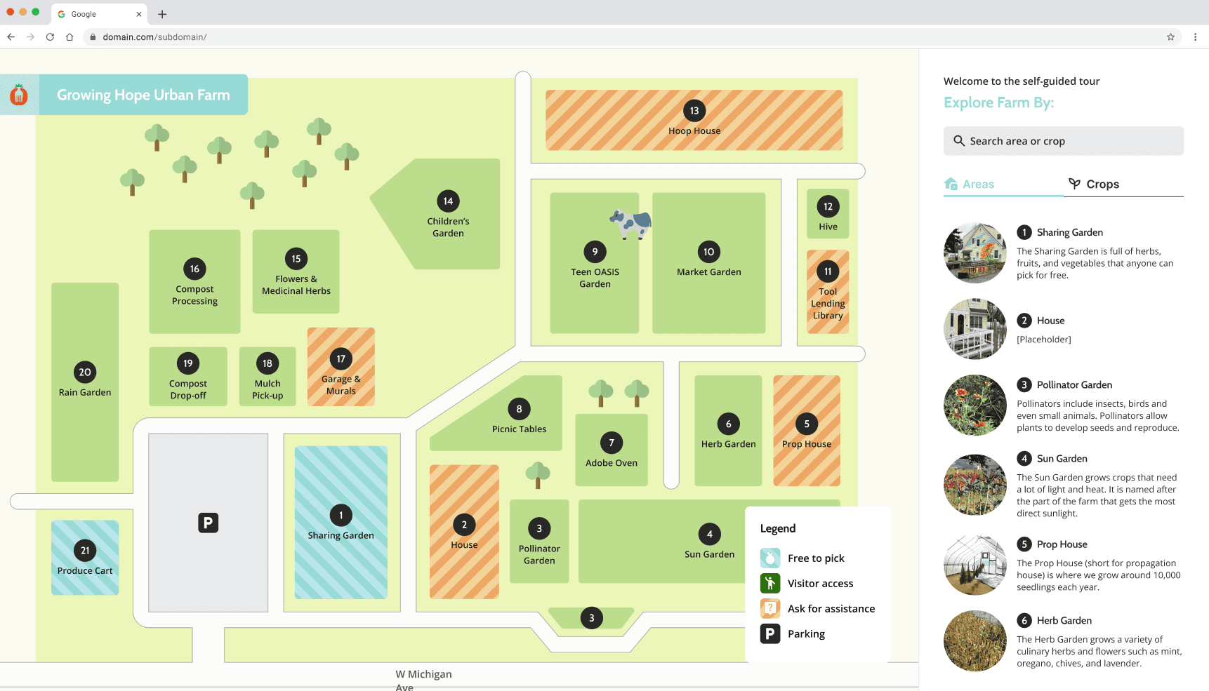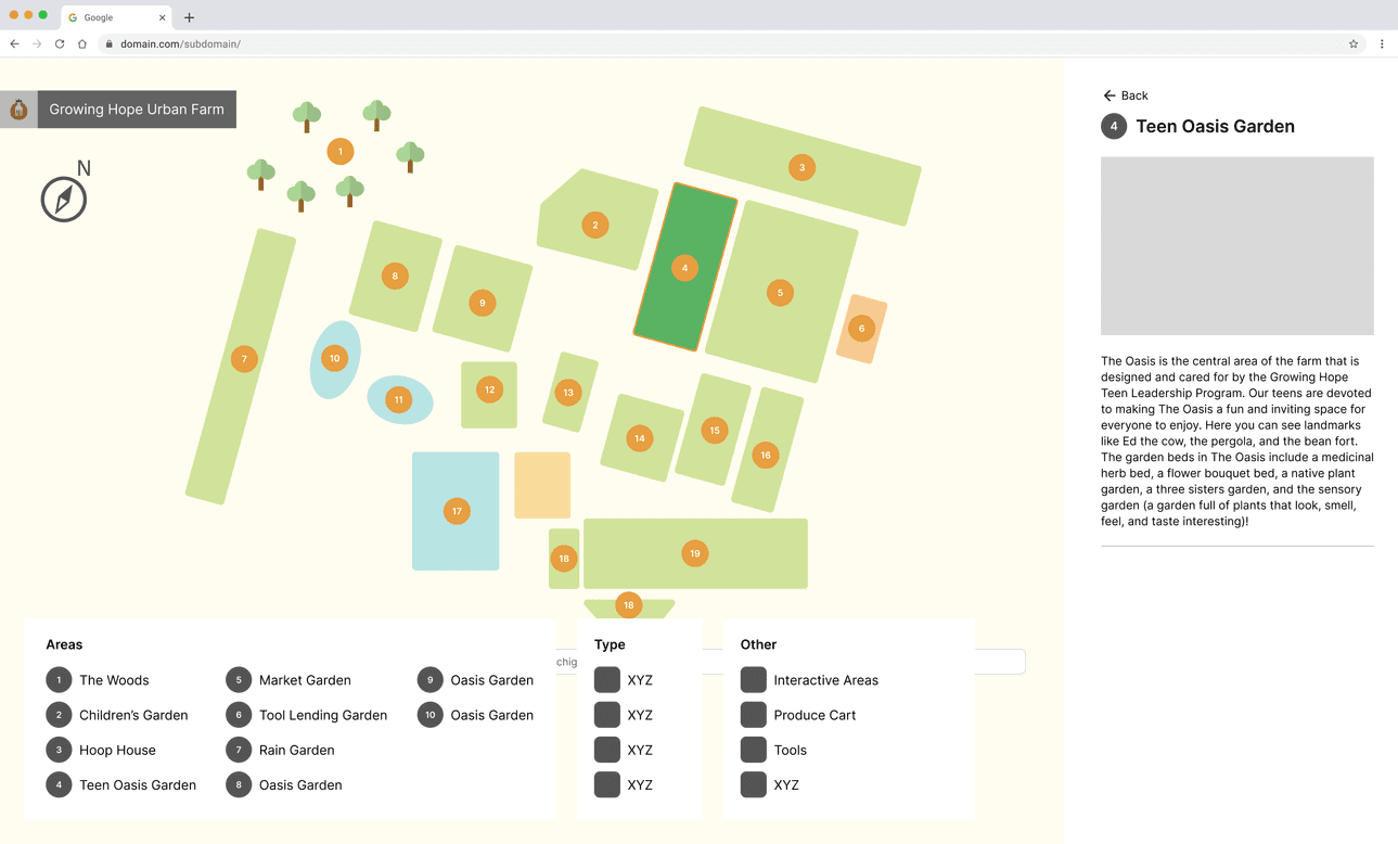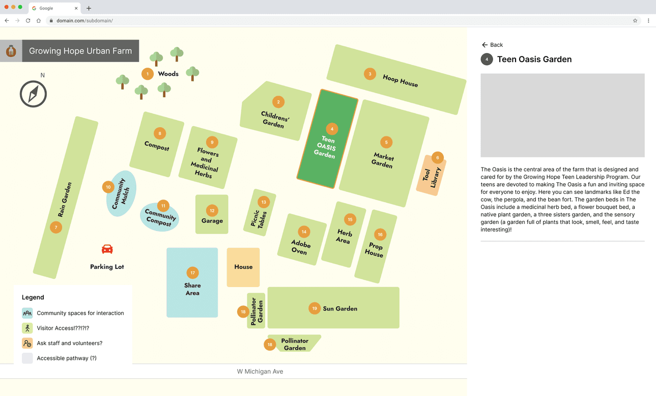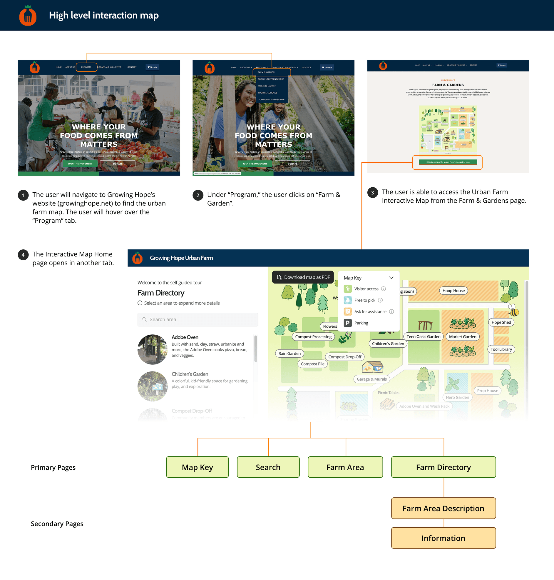 The Interactive map is nested in the Farm & Gardens page of Growing Hope’s website. This flow is indicated in the high-level interaction map, as well as the pages the user can visit within the map.
