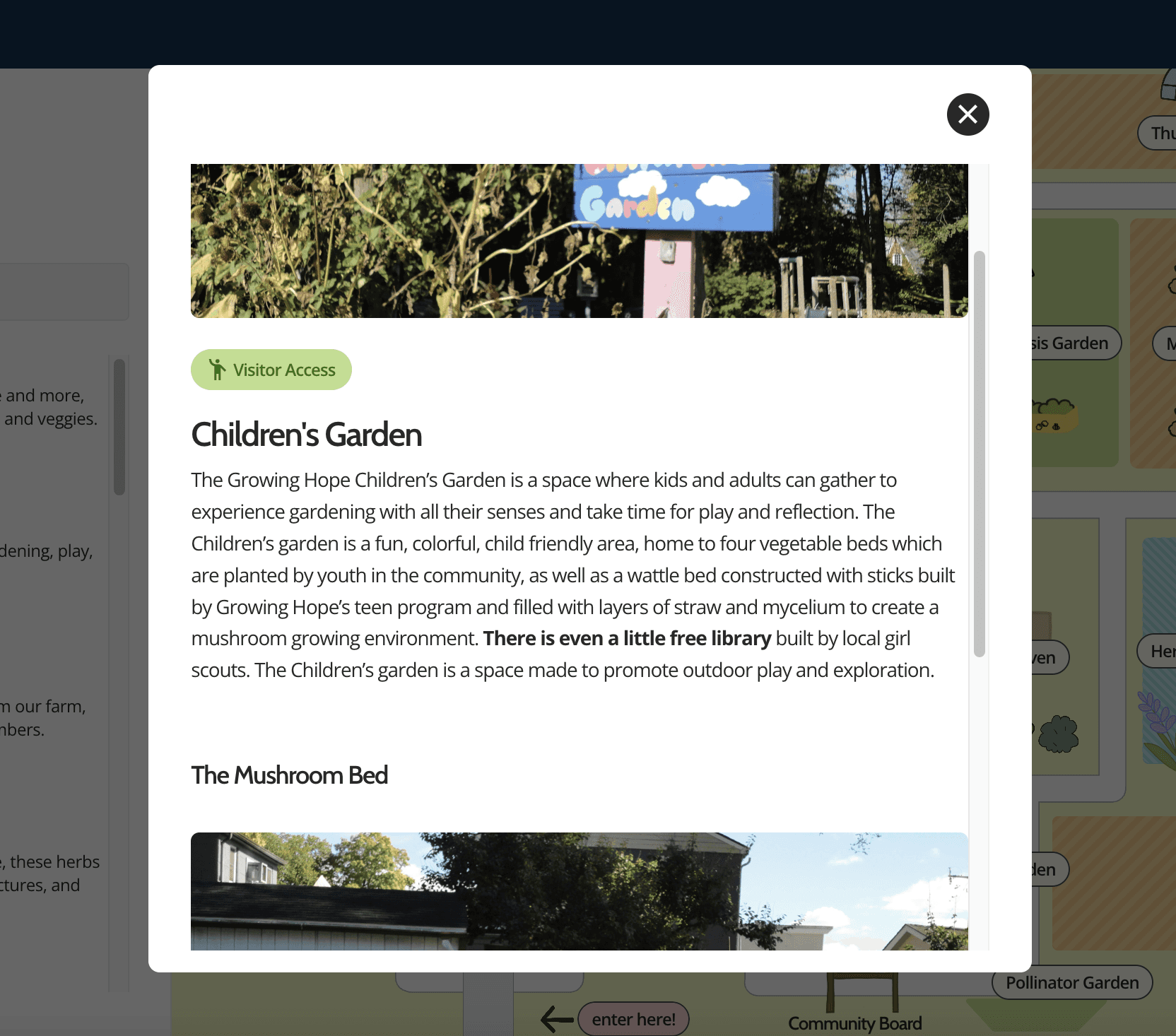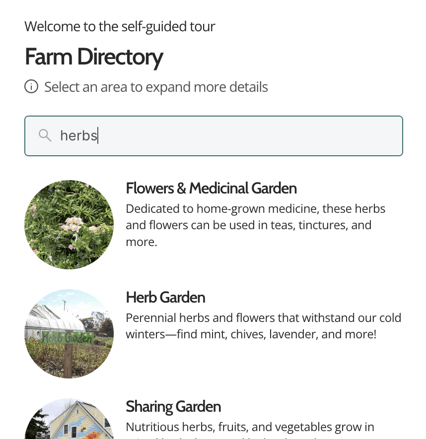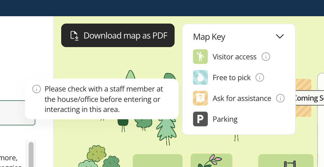 Learn more about each area by clicking into the overlay from the directory! The access level is denoted, along with useful information about what grows in each area, activities that take place there, and other fun facts.