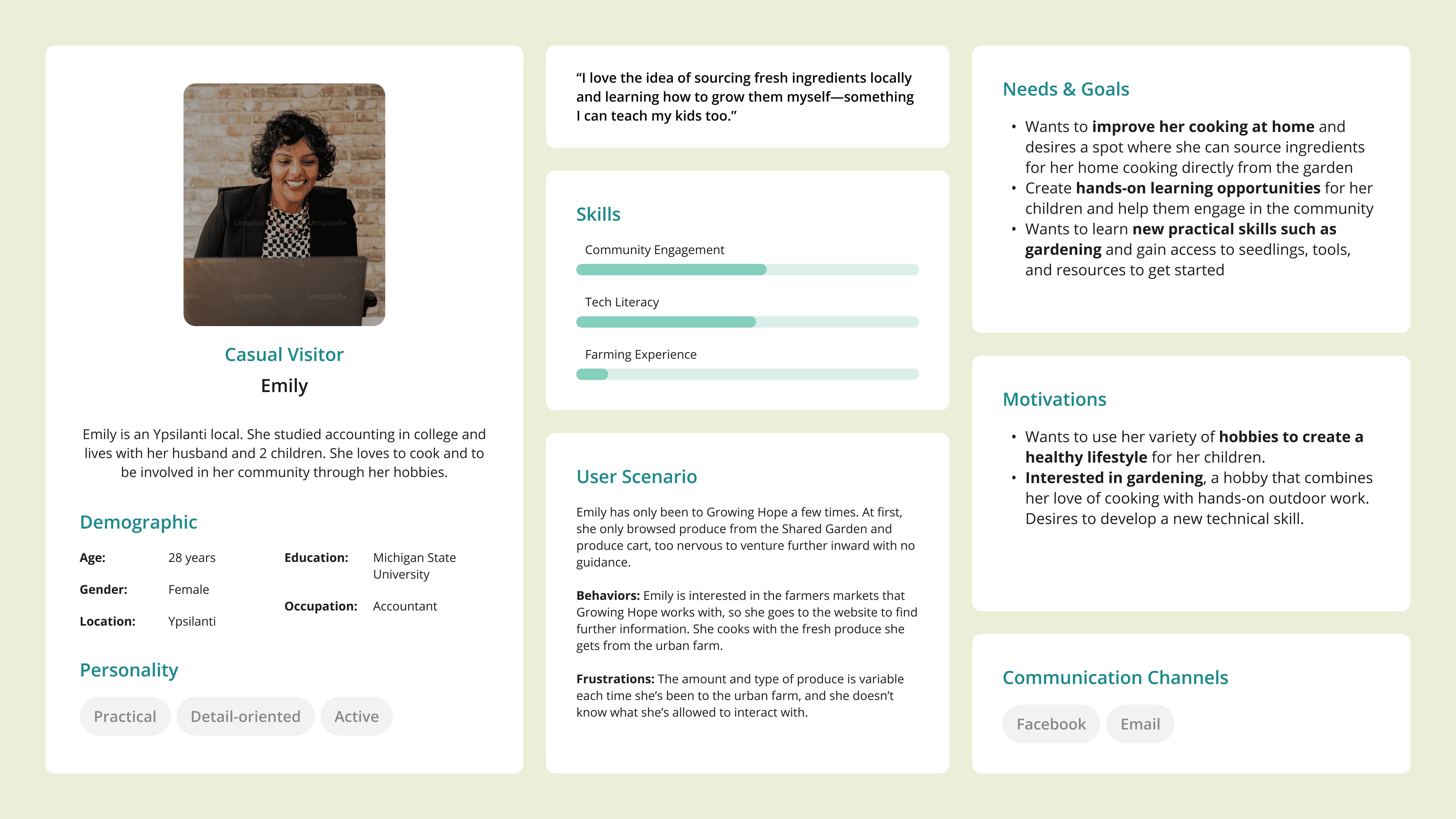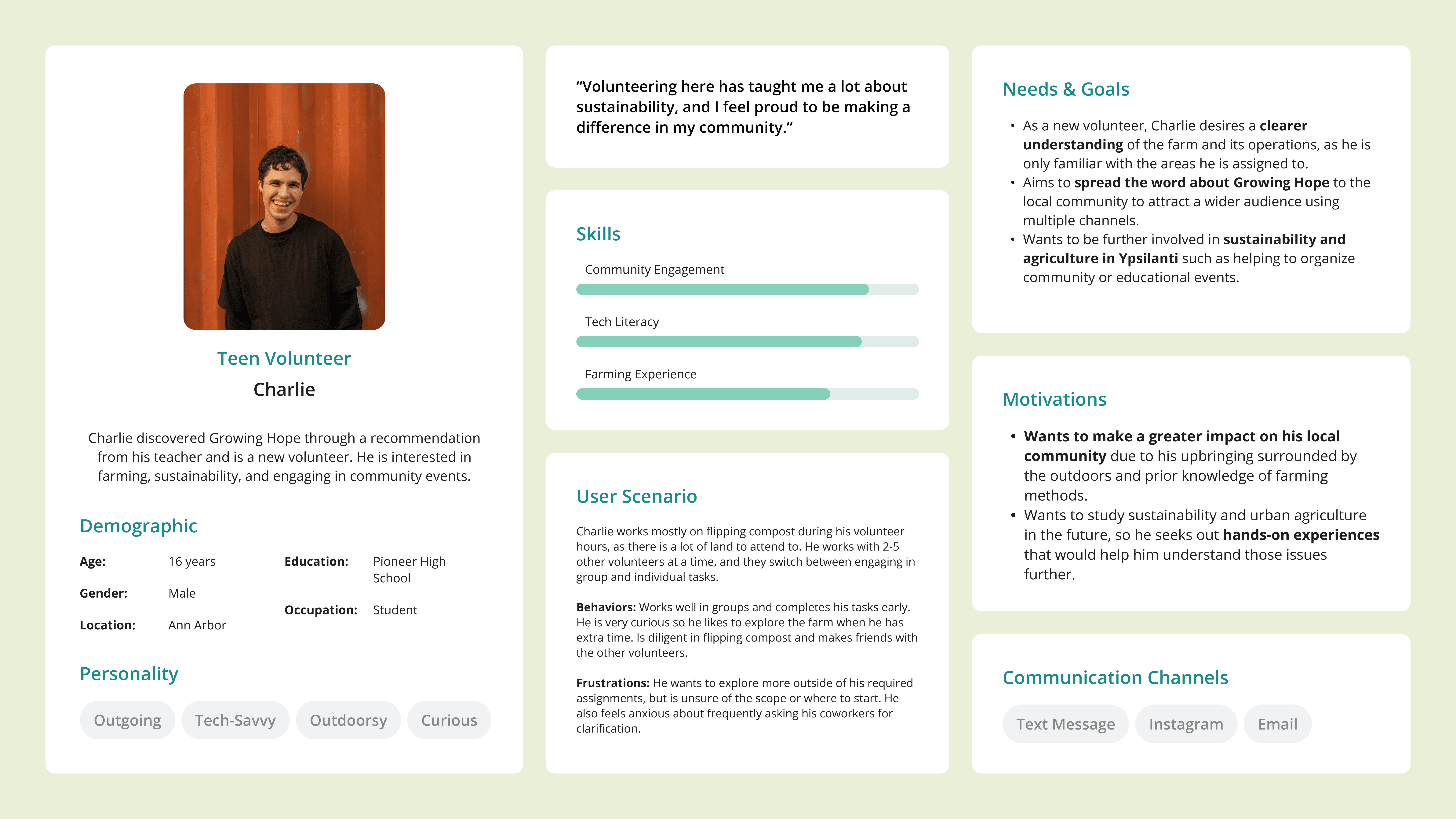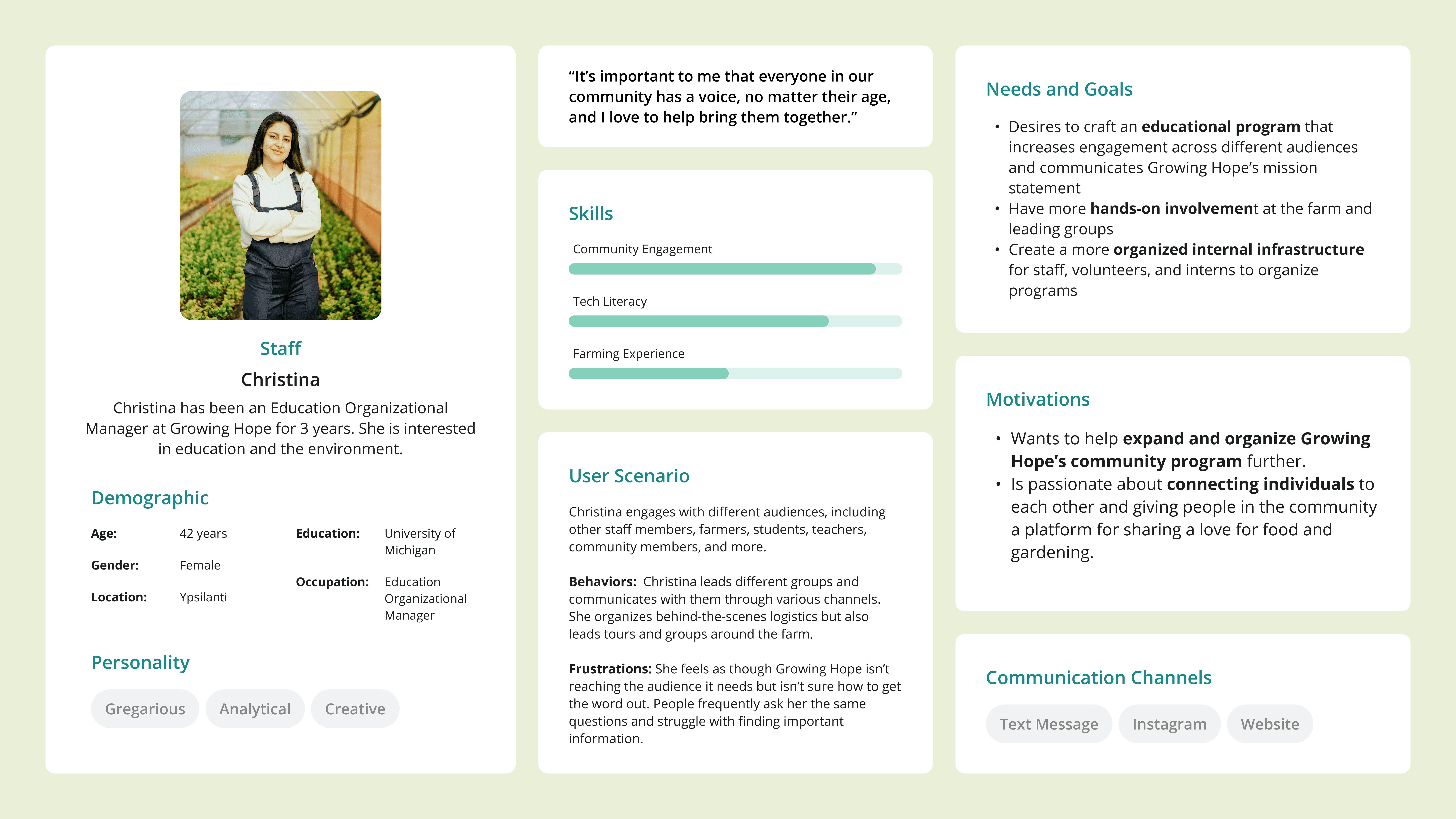 Based on the insights from our research, we created user personas to better understand the motivations, pain points, and behavior of our stakeholders, which included volunteers, educators, staff, and visitors.