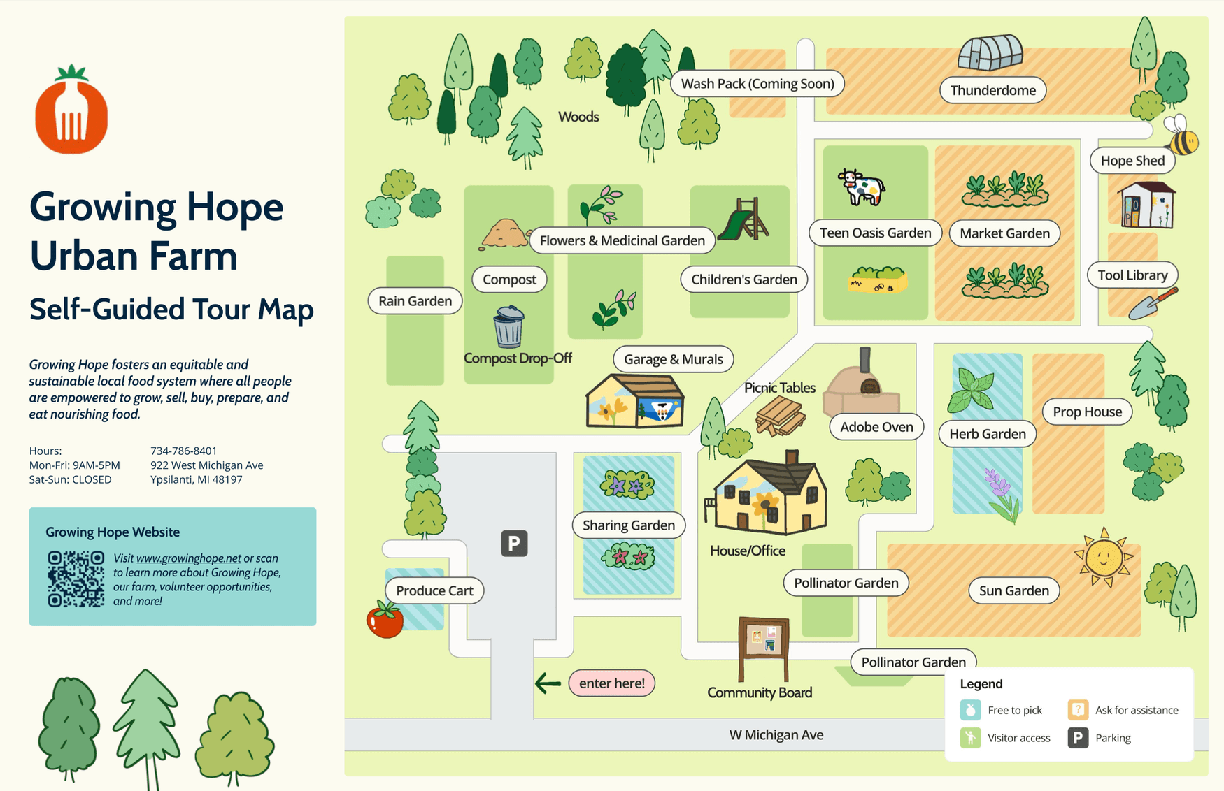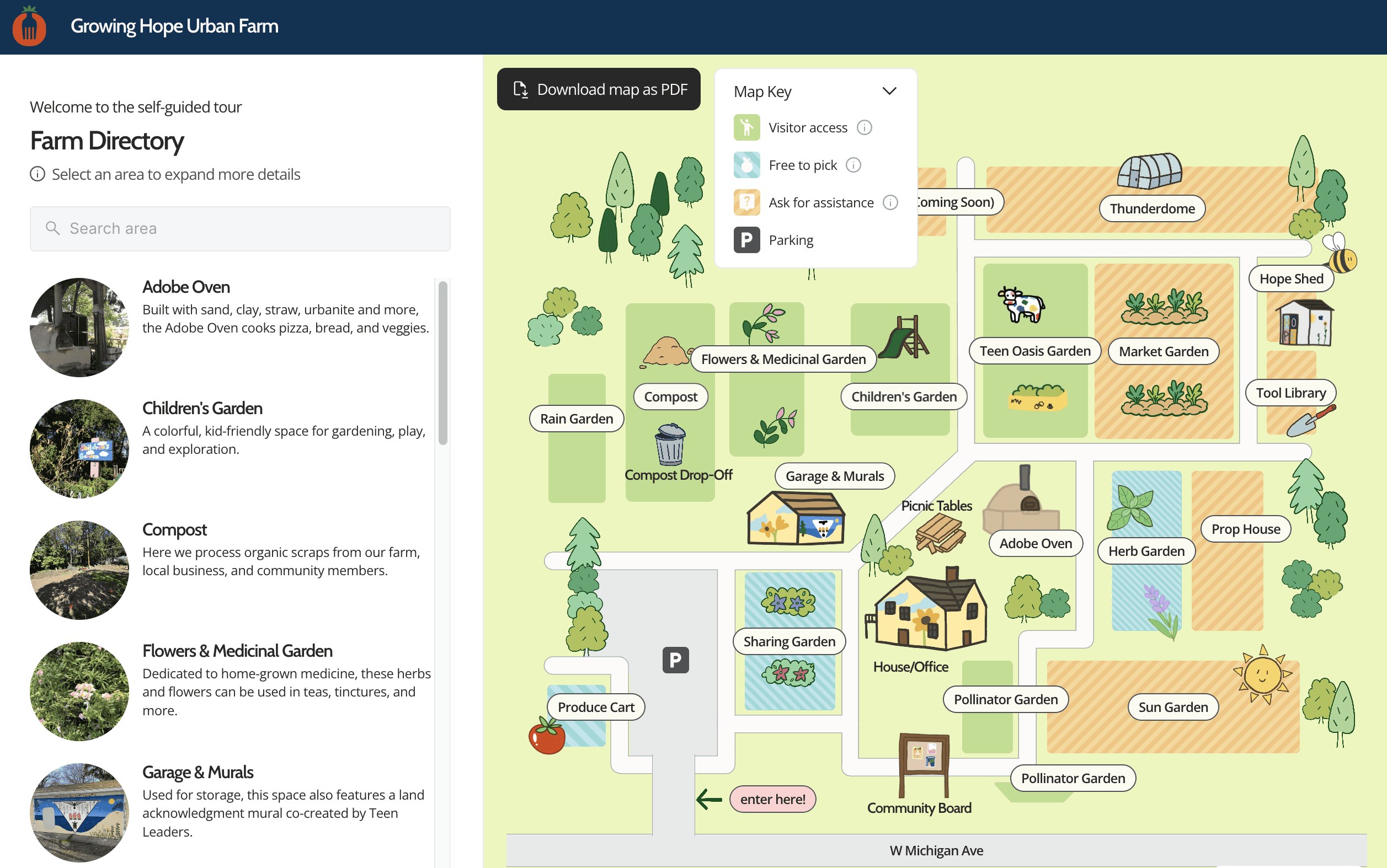 The main screen of the interactive map features an illustrated and colorful view of Growing Hope's farm.
