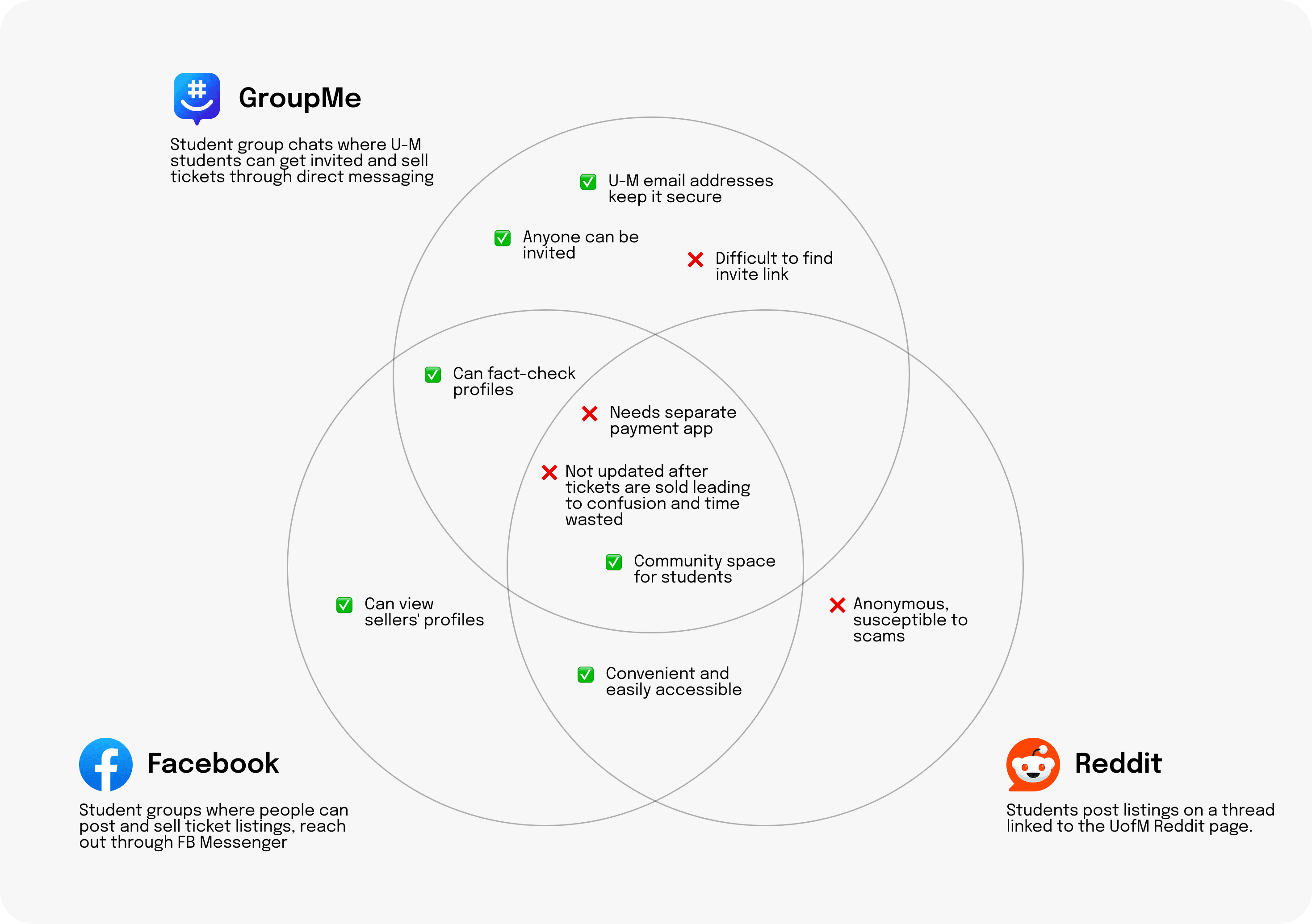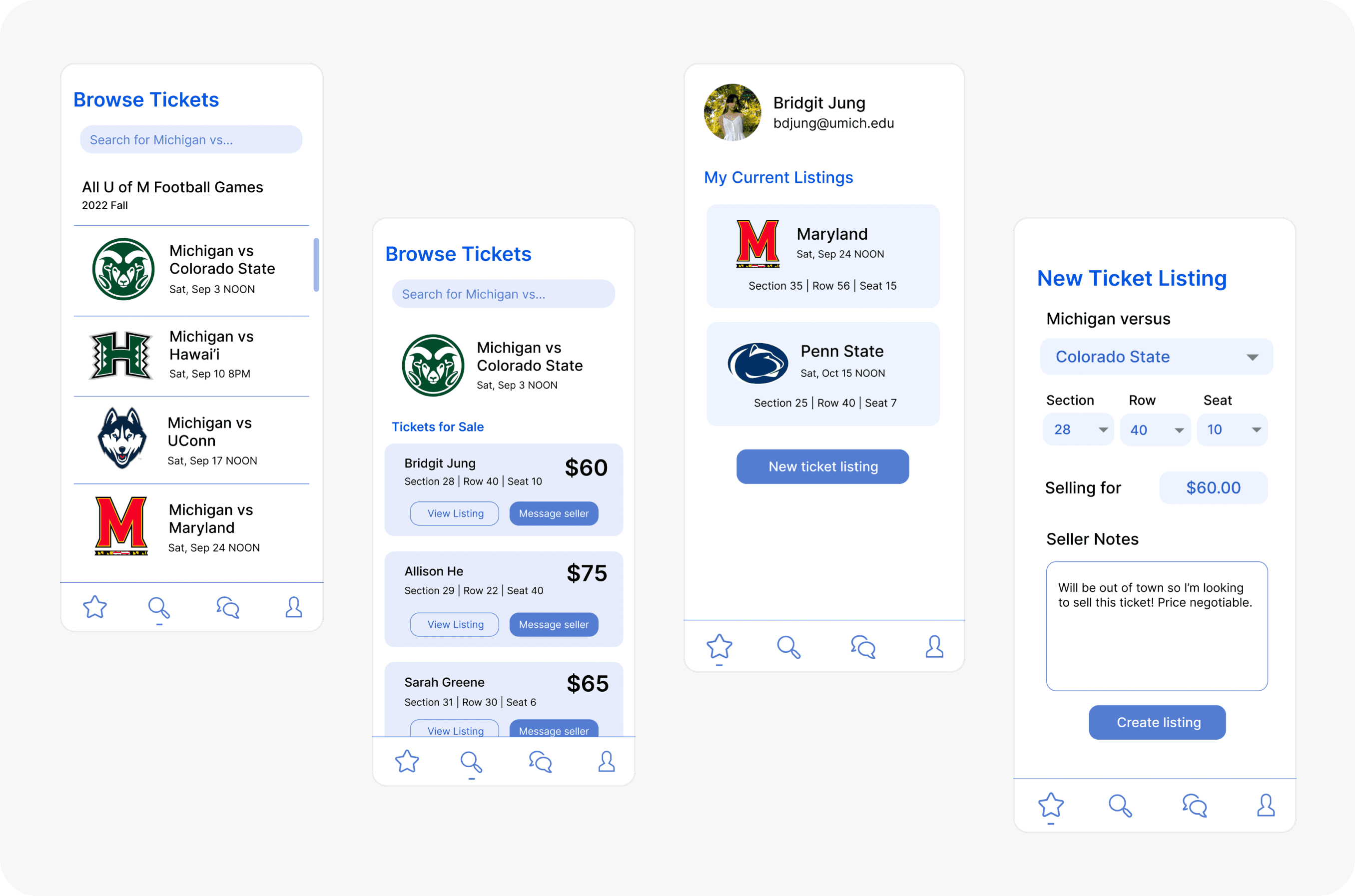 About a week before my professor assigned this project, I was trying to buy tickets for my first football game at U of M ever. I was cycling between Facebook, Reddit, and GroupMe trying to find which tickets were selling at the best price, and messaging sellers on each app. The seller would reply, "sorry, it's been sold." or sometimes not reply at all.